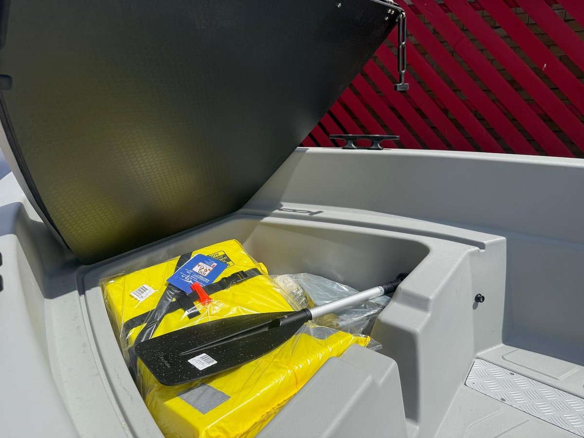 Self-draining. Any water that comes into the boat drains straight out the back, it can’t get into the hull. No need for a bilge pump.