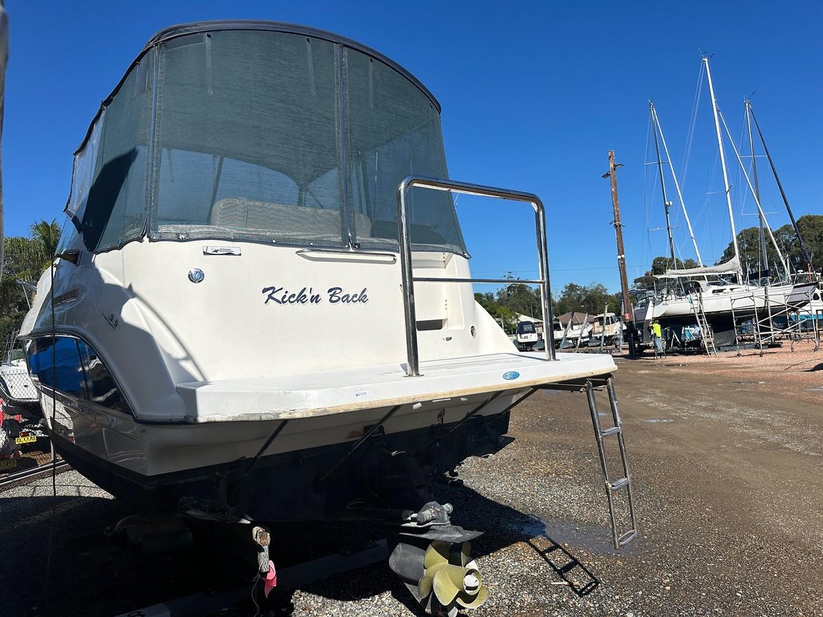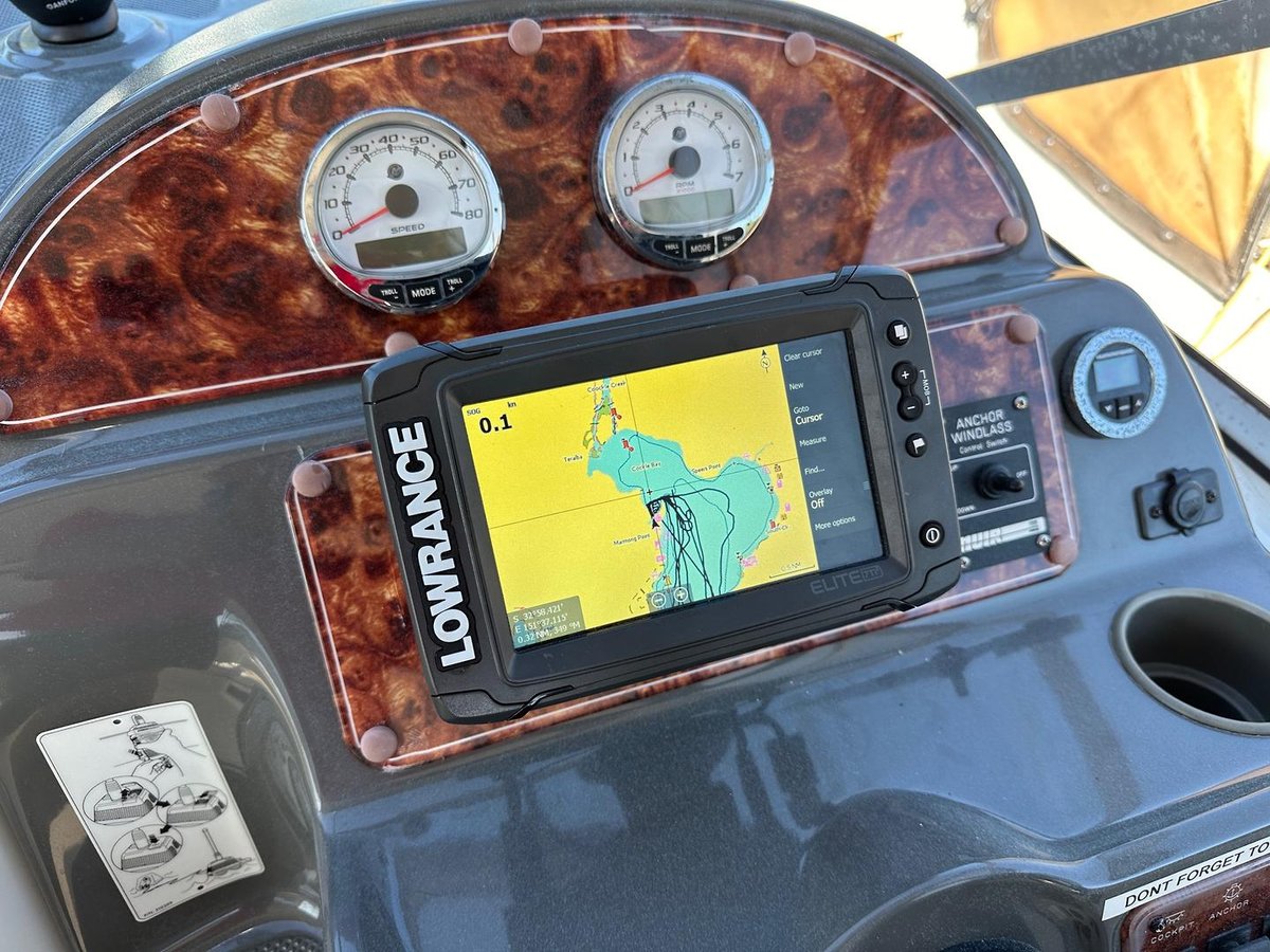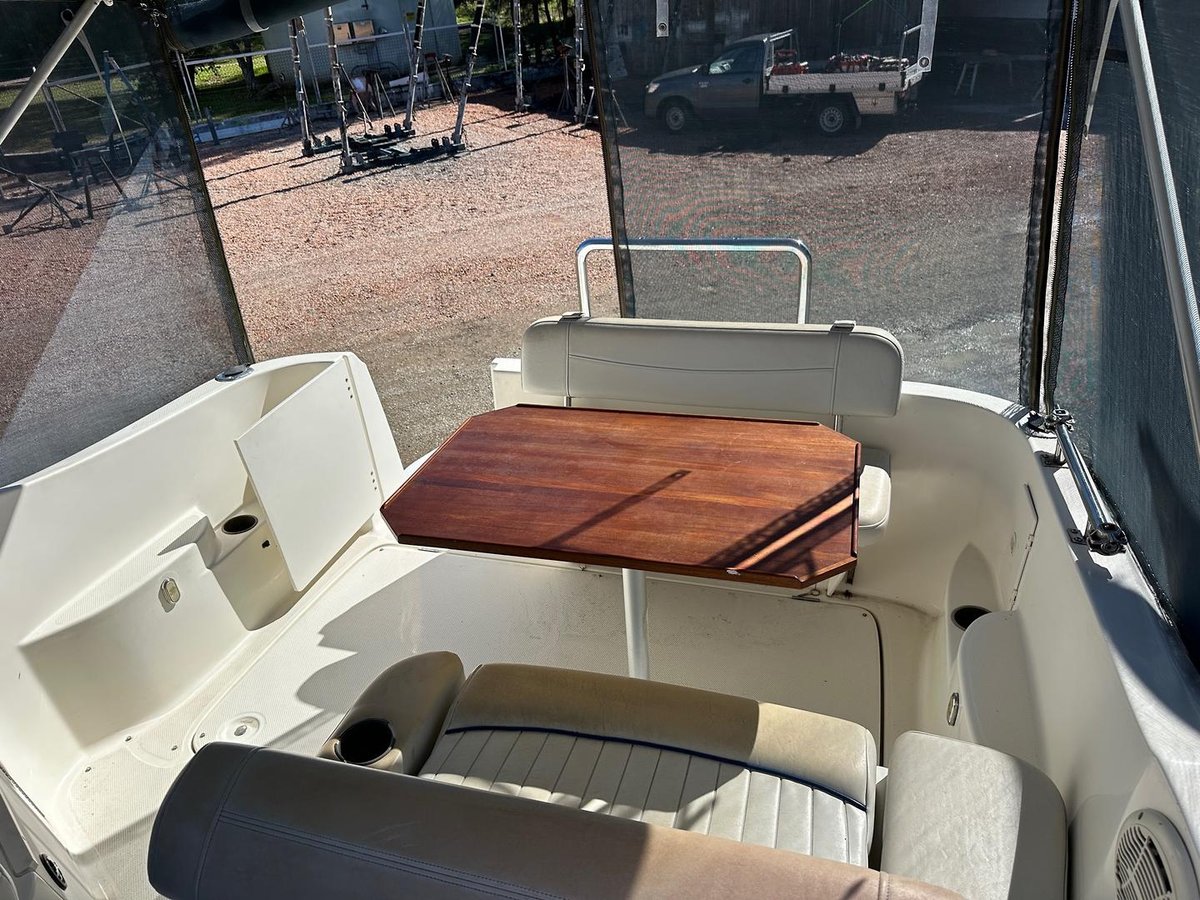 This boat is fitted with the following equipment power anchor winch, bow rail, gelcoat hull stripe, fully enclosed covers(covers are getting towards the end of their life), extended boarding platform, boarding ladder, stainless rear rail, twin batteries one large house battery, hot water service, cockpit seating(upholstery is sun damaged), tram style reversible seat, cockpit table, Smarft Craft digital instrumentation, Lowrance Elite 7 colour GPS/Fishfinder with NMEA interface for engine read-outs, compass, seperate depth gauge, 240 volt panel down stairs, refrigerator, sink, toilet, shower, dinette that converts to large double bed, opening port holes, cabin lights, rear cabin.