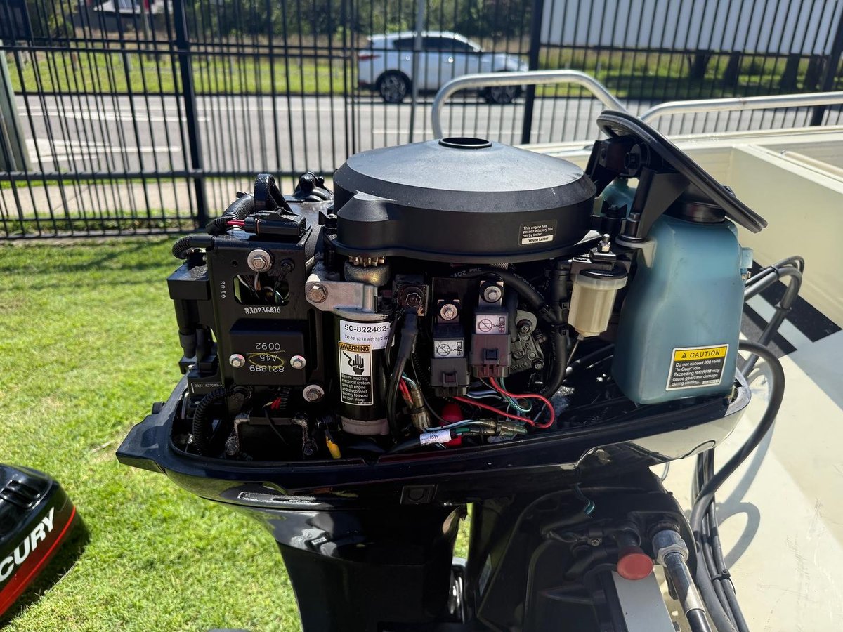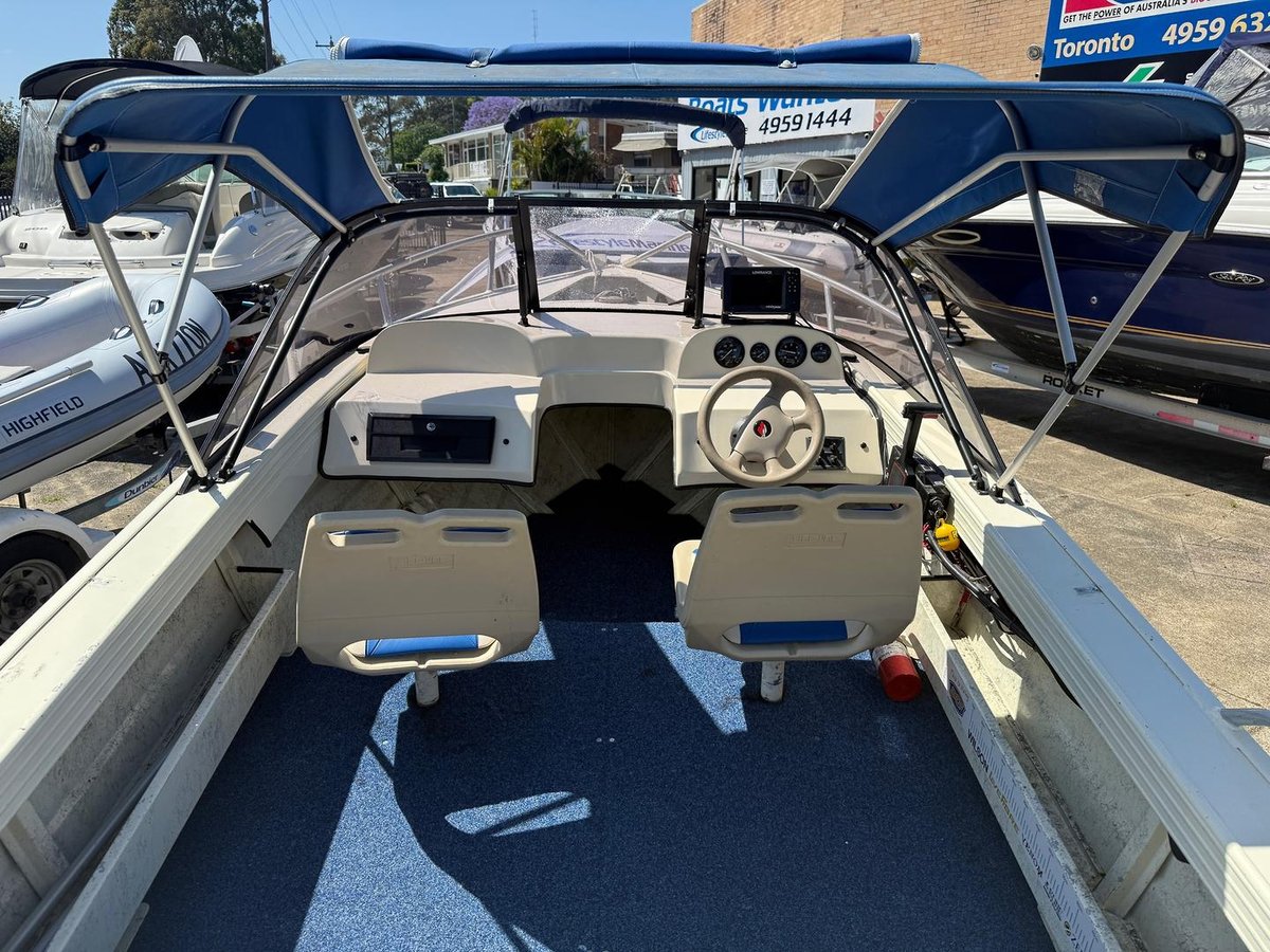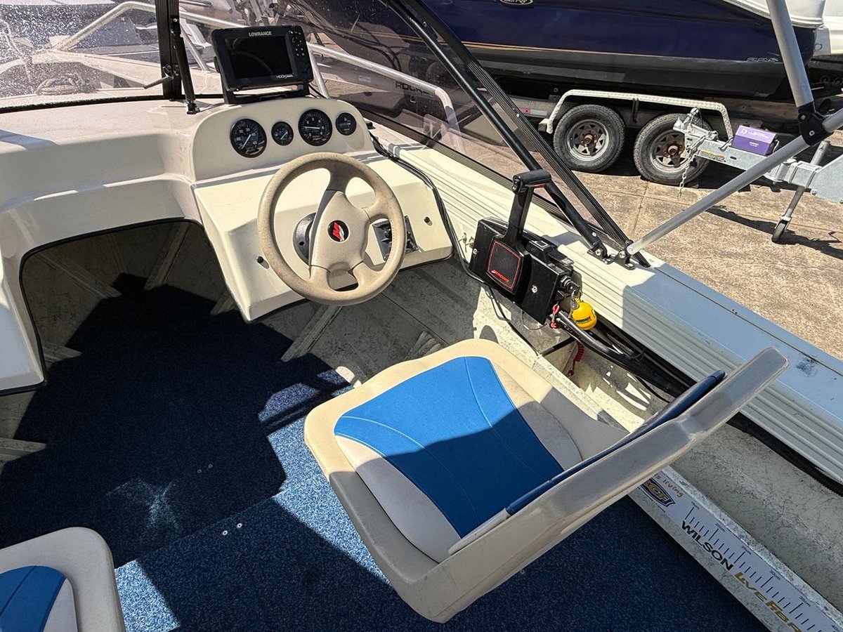 This one is fitted with bow and side rails, rear boarding step, full width engine well, folding and removable rear lounge, full floor, wide side decks, side pockets, driver and passenger padded seats, fibreglass dash, Lowrance 7 inch colour GPS/Fishfinder, engine instrumentation, drink holder, glove box, opening windscreen, switch panel, navigation lights, bilge pump, battery switch, canopy with opening centre curtain.