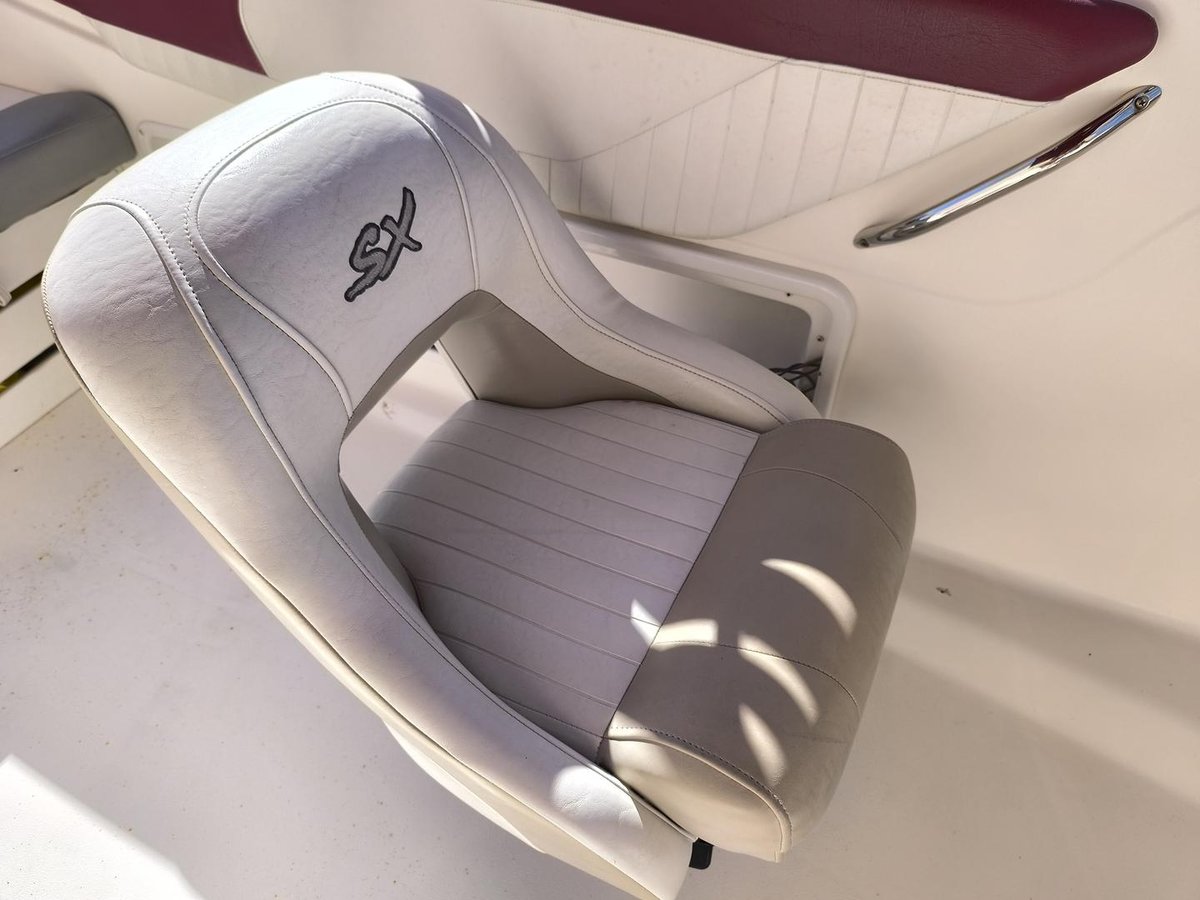This example is fitted with a coloured hull, wake tower, wakeboard racks, ski mirror, large Bimini top, moulded rear swim platform, stainless steel boarding ladder, full-width sunpad with huge storage either side of the engine, full width rear lounge, large underfloor storage, glove box, cup holders, full engine instrumentation and bow seating.