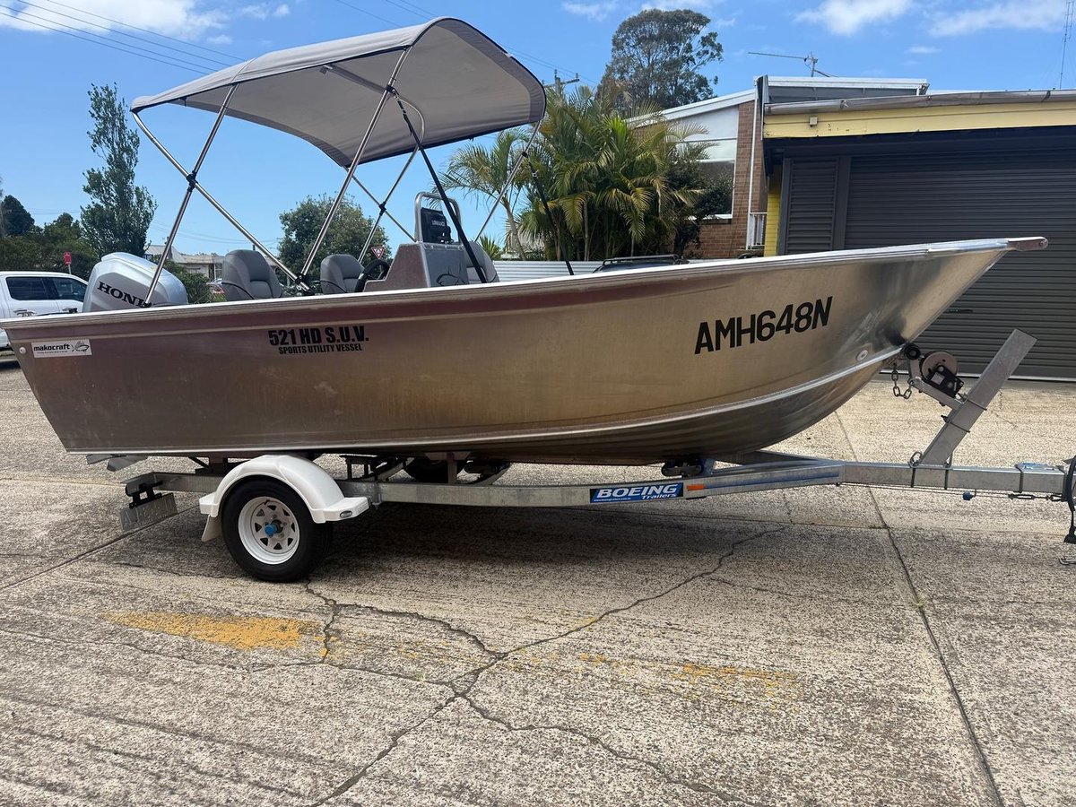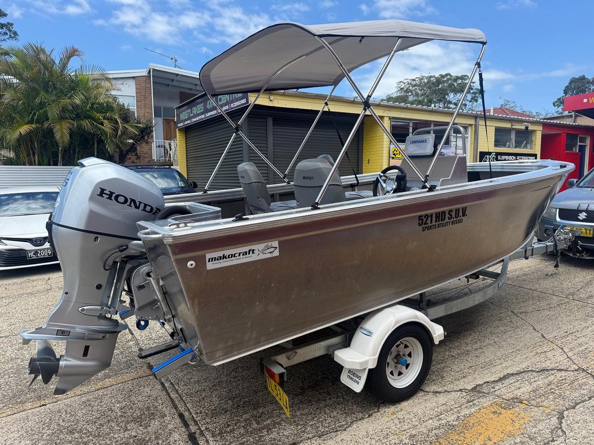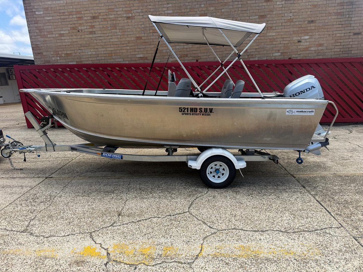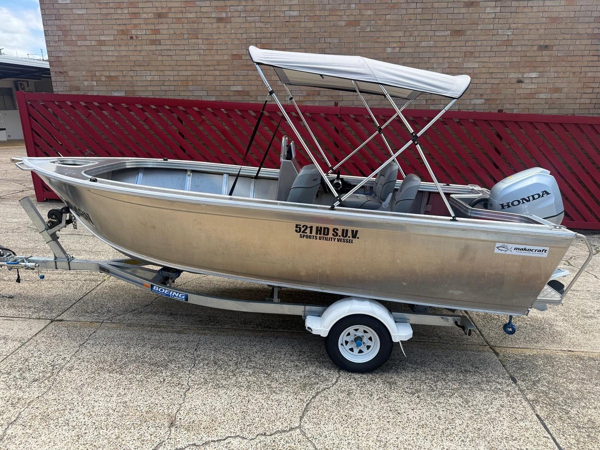 Makocraft 521 HD SUV side console with lots of extra, in very good condition with plenty of factory warranty. 2024 Honda BF75 with only 30 hours. 2024 Boeing heavy duty galvanised drive-on trailer with plastic mudguards.
