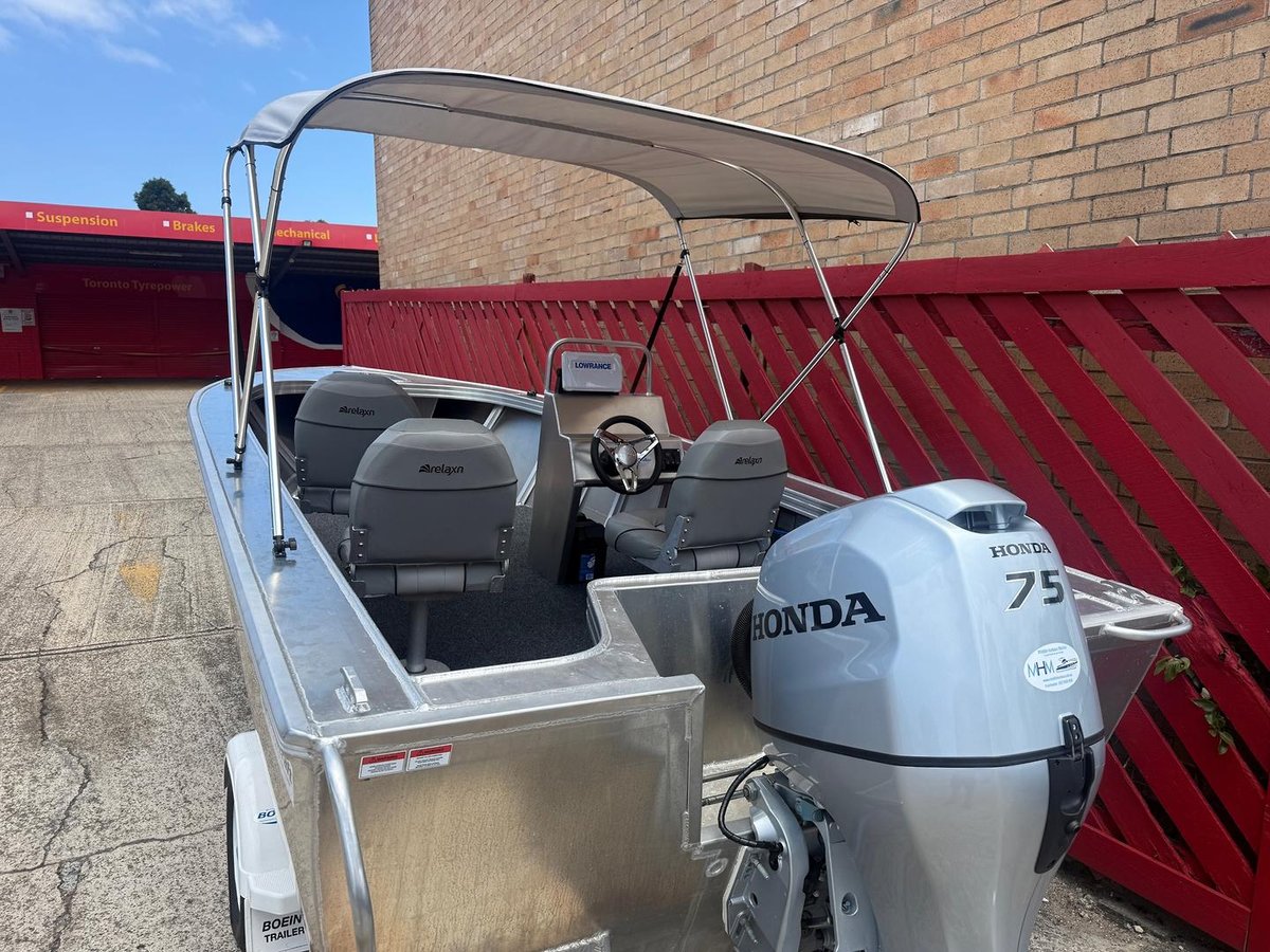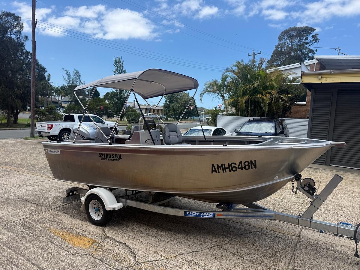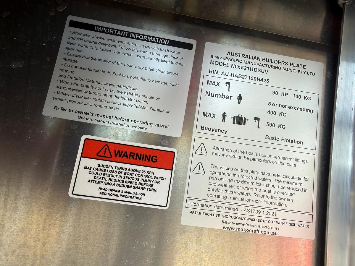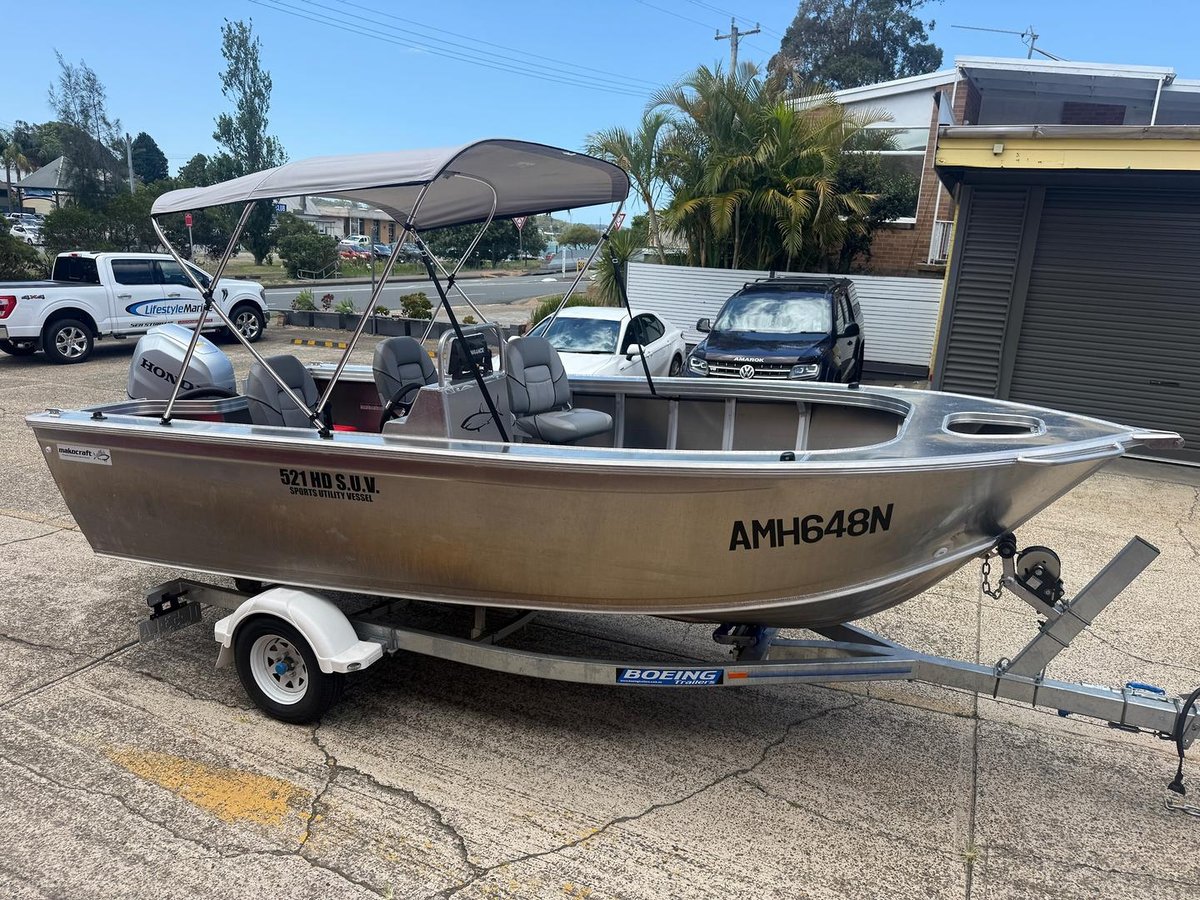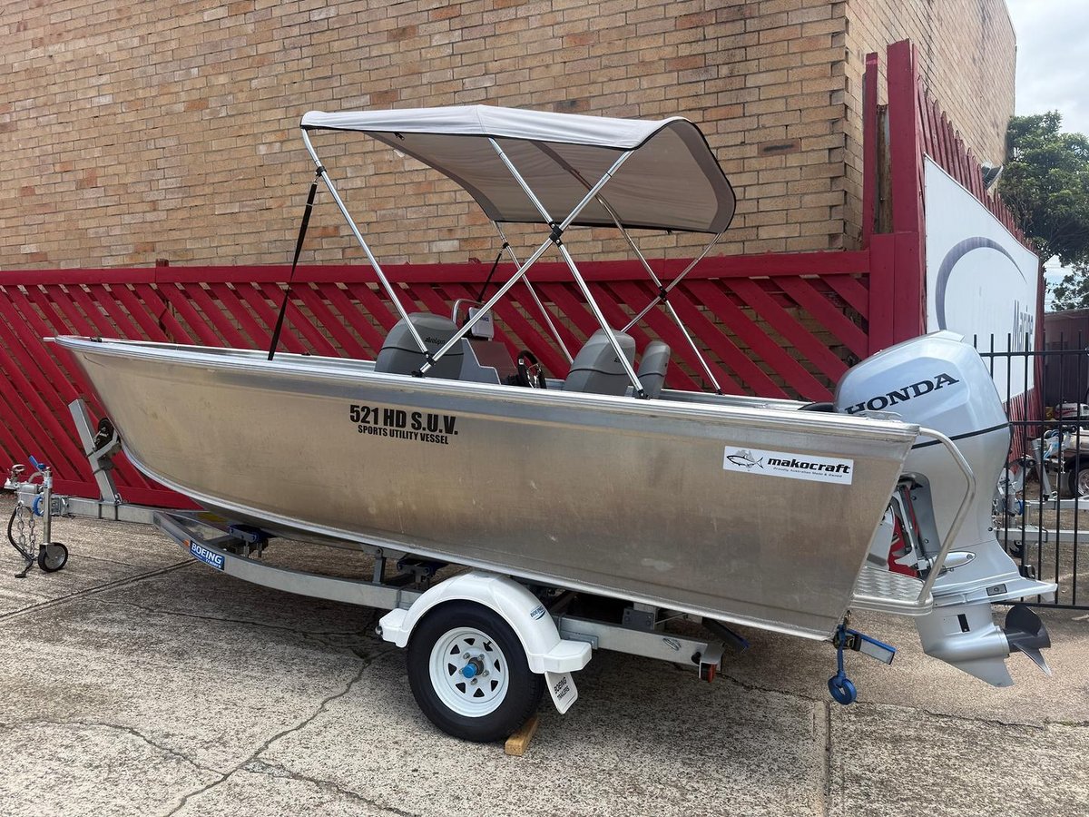 Makocraft 521 HD SUV side console with lots of extra, in very good condition with plenty of factory warranty. 2024 Honda BF75 with only 30 hours. 2024 Boeing heavy duty galvanised drive-on trailer with plastic mudguards.