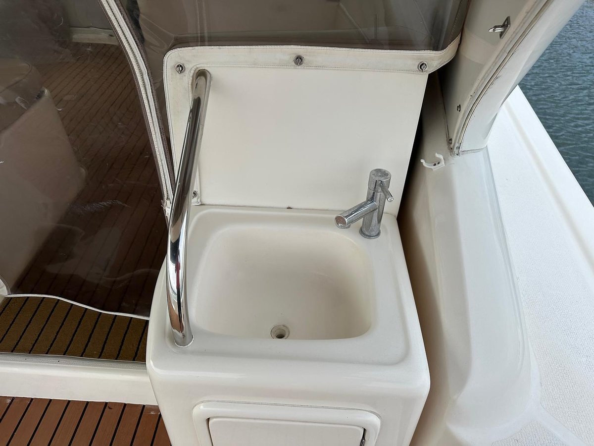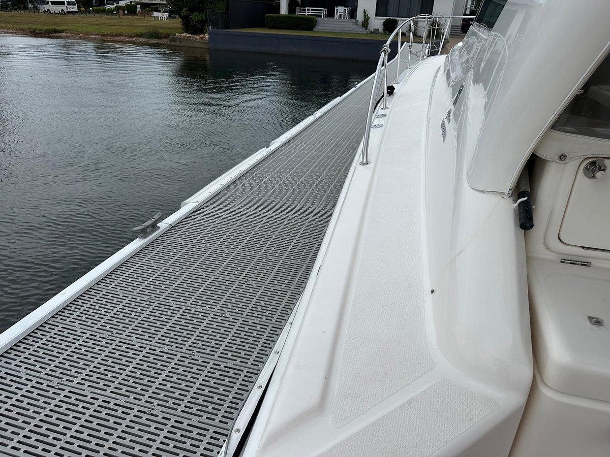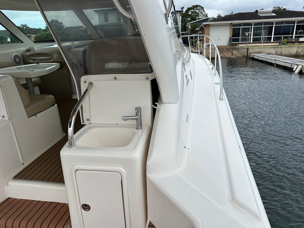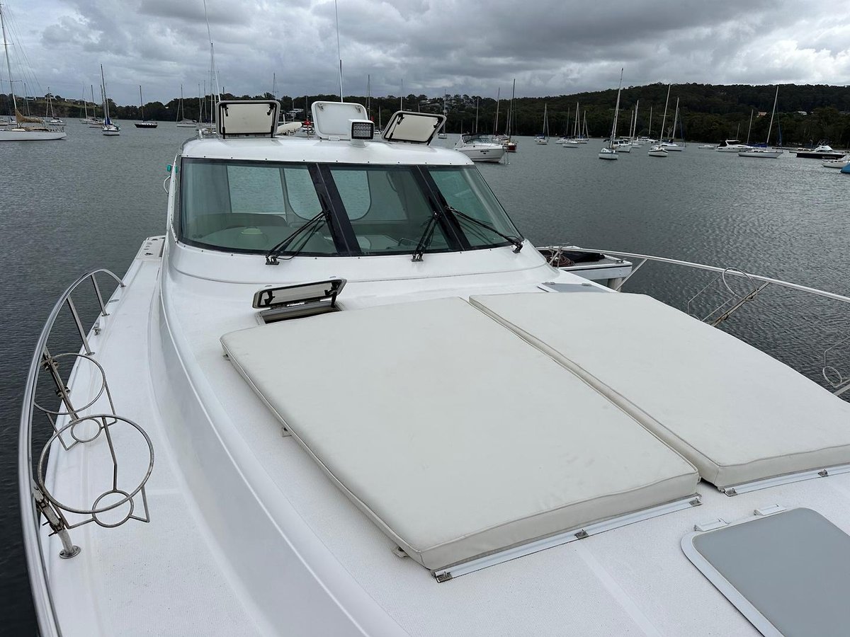 This one is fitted with Sidepower bowthruster(recently fitted), Muir anchor winch, bow rails, bow sunpad and cover, huge walkaround side decks, LED remote spot light(recently fitted), hard top deck hatches, bases for outriggers, moulded boarding platform, boarding ladder, stainless steel rear rail, davit bases for inflatable, transom door, underwater lights, stainless steel BBQ, plumbed live bait tank, rod holders, rear sun awning with stainless steel vertical rod racks, sun shade rear curtains around the sun awning, Flexi Teak flooring, large cockpit 12 volt ice box, cockpit sink with hot and cold water, electric actuator to lift upper cockpit floor for easy engine access, clear curtains to separate lower and upper cockpit to hold cabin air conditioning, large table, refrigerator, dual helm seat, Raymarine GPS/Fishfinder, I-Com VHF radio, Fusion stereo with subwoofer running through Rockford speakers through out(recently fitted), galley refrigerator, microwave, cooktop, air conditioning, salon table, convertible lounge to beds/bunk, LCD TV, plenty of opening deck hatches in salon head and master cabin, hanging cupboards.