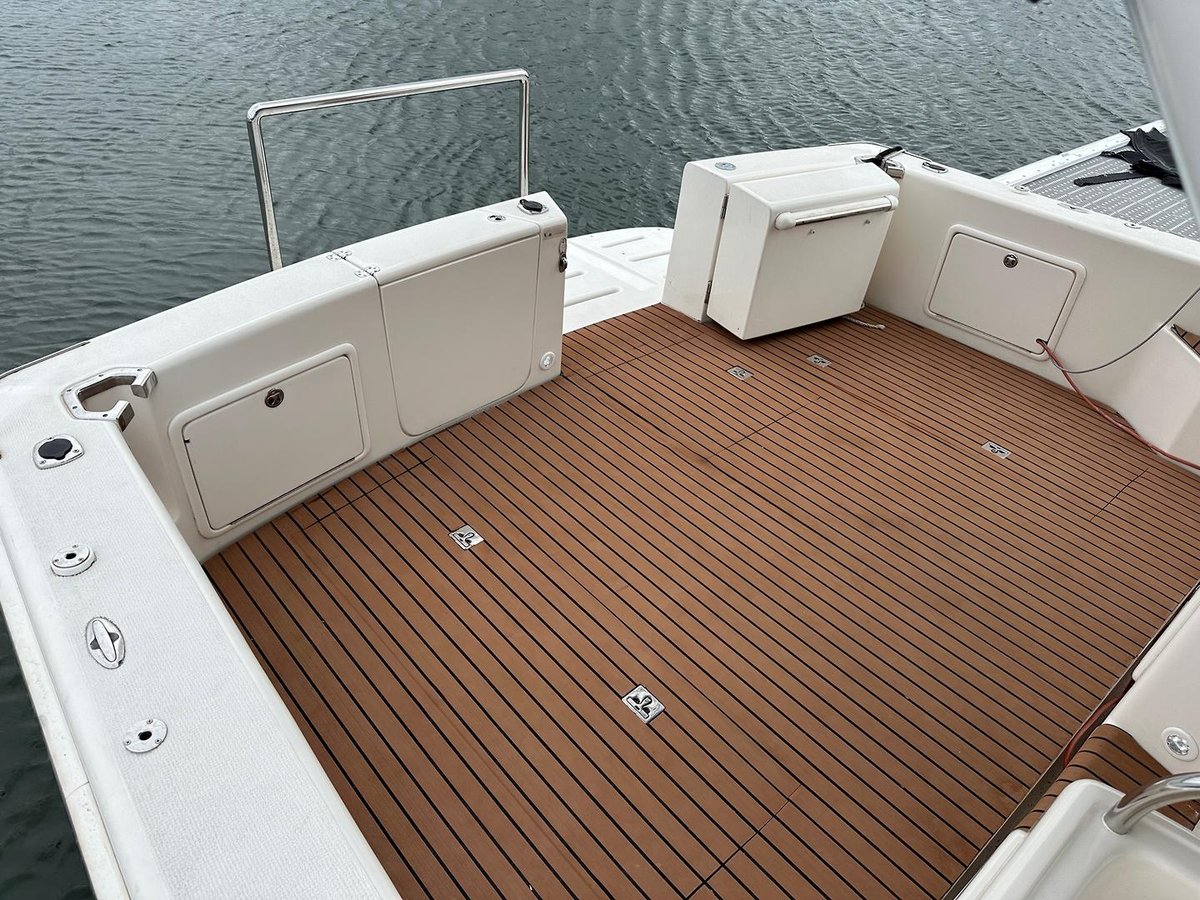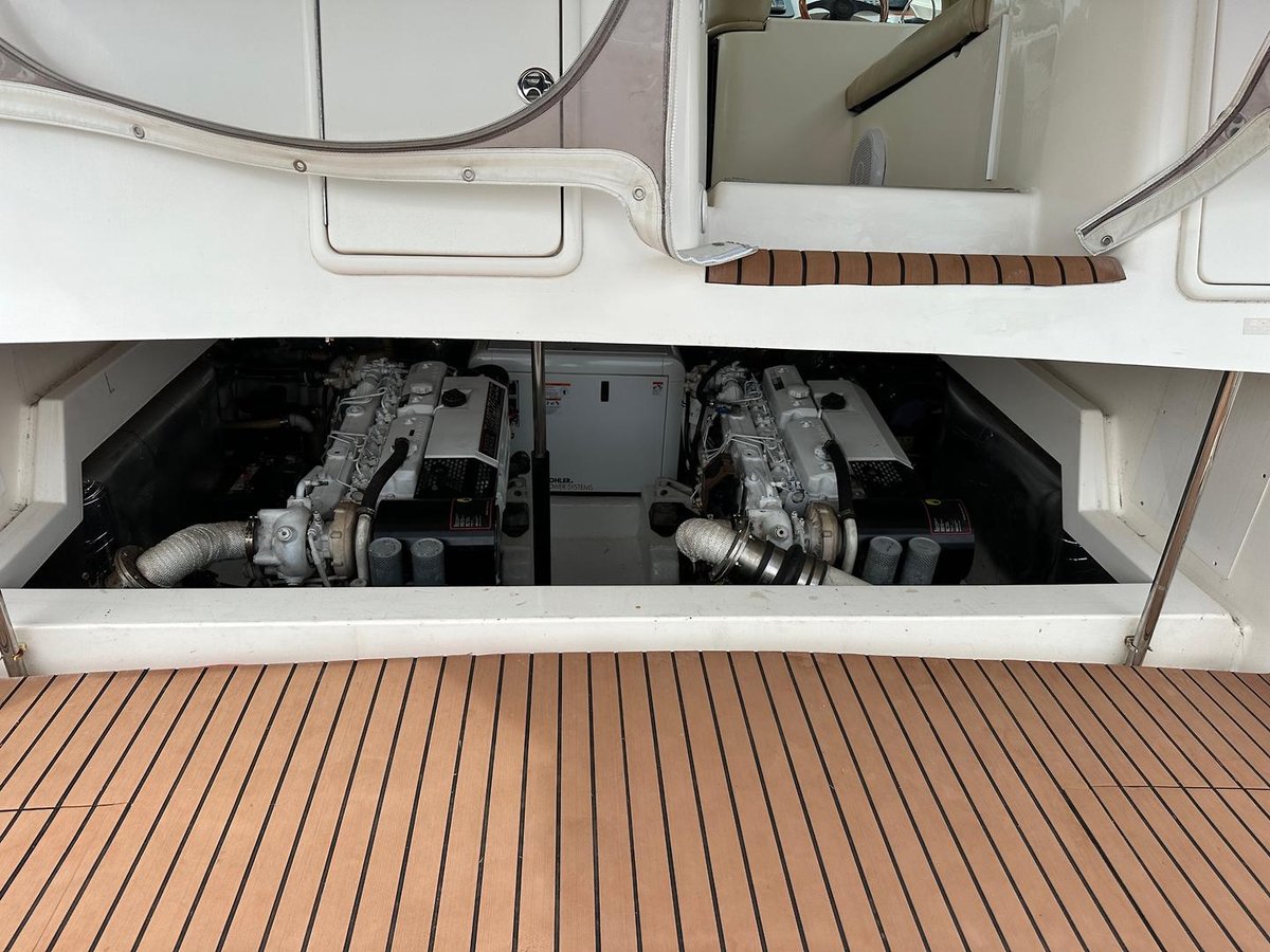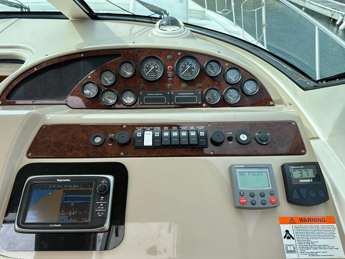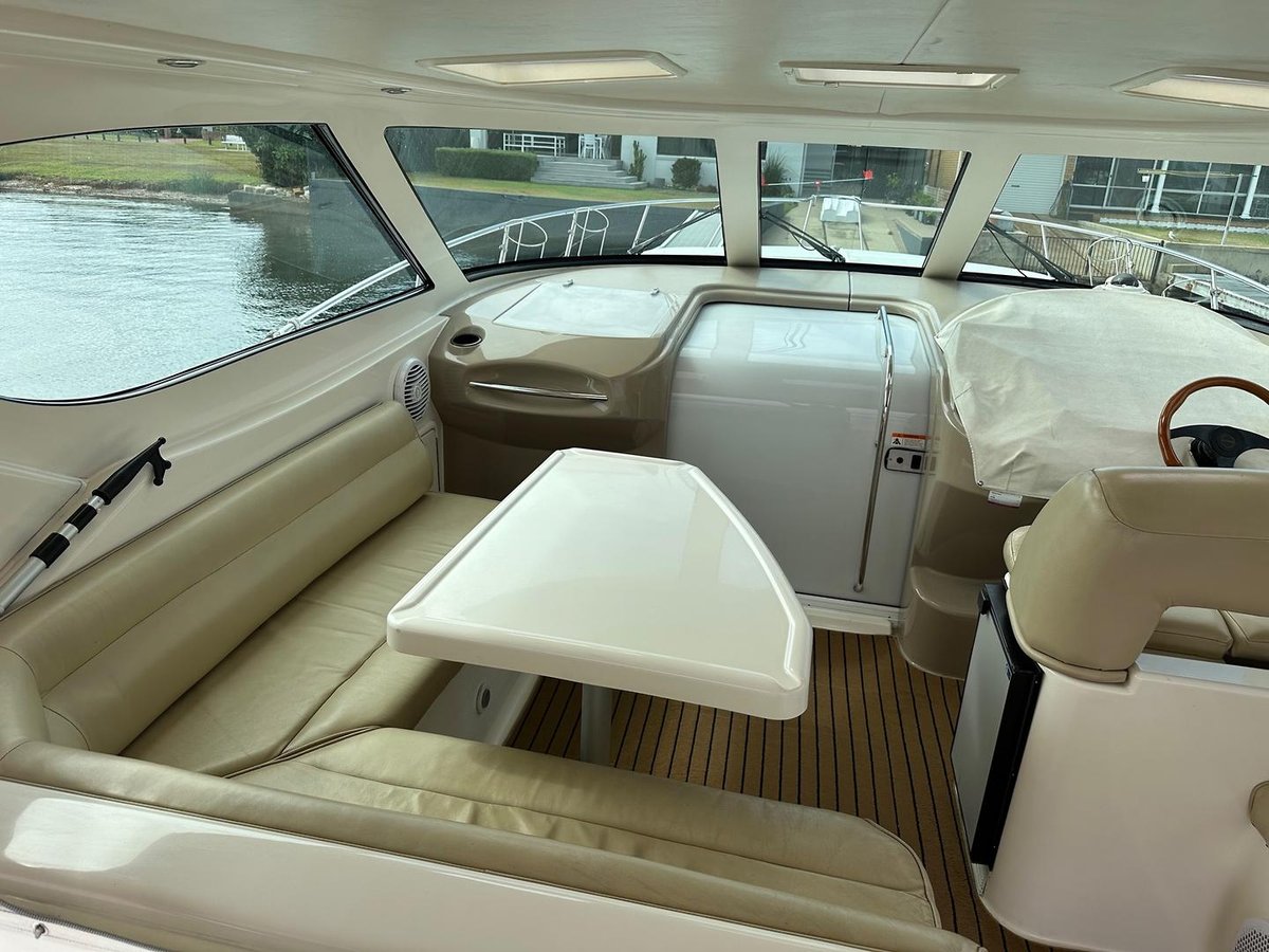 This one is fitted with Sidepower bowthruster(recently fitted), Muir anchor winch, bow rails, bow sunpad and cover, huge walkaround side decks, LED remote spot light(recently fitted), hard top deck hatches, bases for outriggers, moulded boarding platform, boarding ladder, stainless steel rear rail, davit bases for inflatable, transom door, underwater lights, stainless steel BBQ, plumbed live bait tank, rod holders, rear sun awning with stainless steel vertical rod racks, sun shade rear curtains around the sun awning, Flexi Teak flooring, large cockpit 12 volt ice box, cockpit sink with hot and cold water, electric actuator to lift upper cockpit floor for easy engine access, clear curtains to separate lower and upper cockpit to hold cabin air conditioning, large table, refrigerator, dual helm seat, Raymarine GPS/Fishfinder, I-Com VHF radio, Fusion stereo with subwoofer running through Rockford speakers through out(recently fitted), galley refrigerator, microwave, cooktop, air conditioning, salon table, convertible lounge to beds/bunk, LCD TV, plenty of opening deck hatches in salon head and master cabin, hanging cupboards.