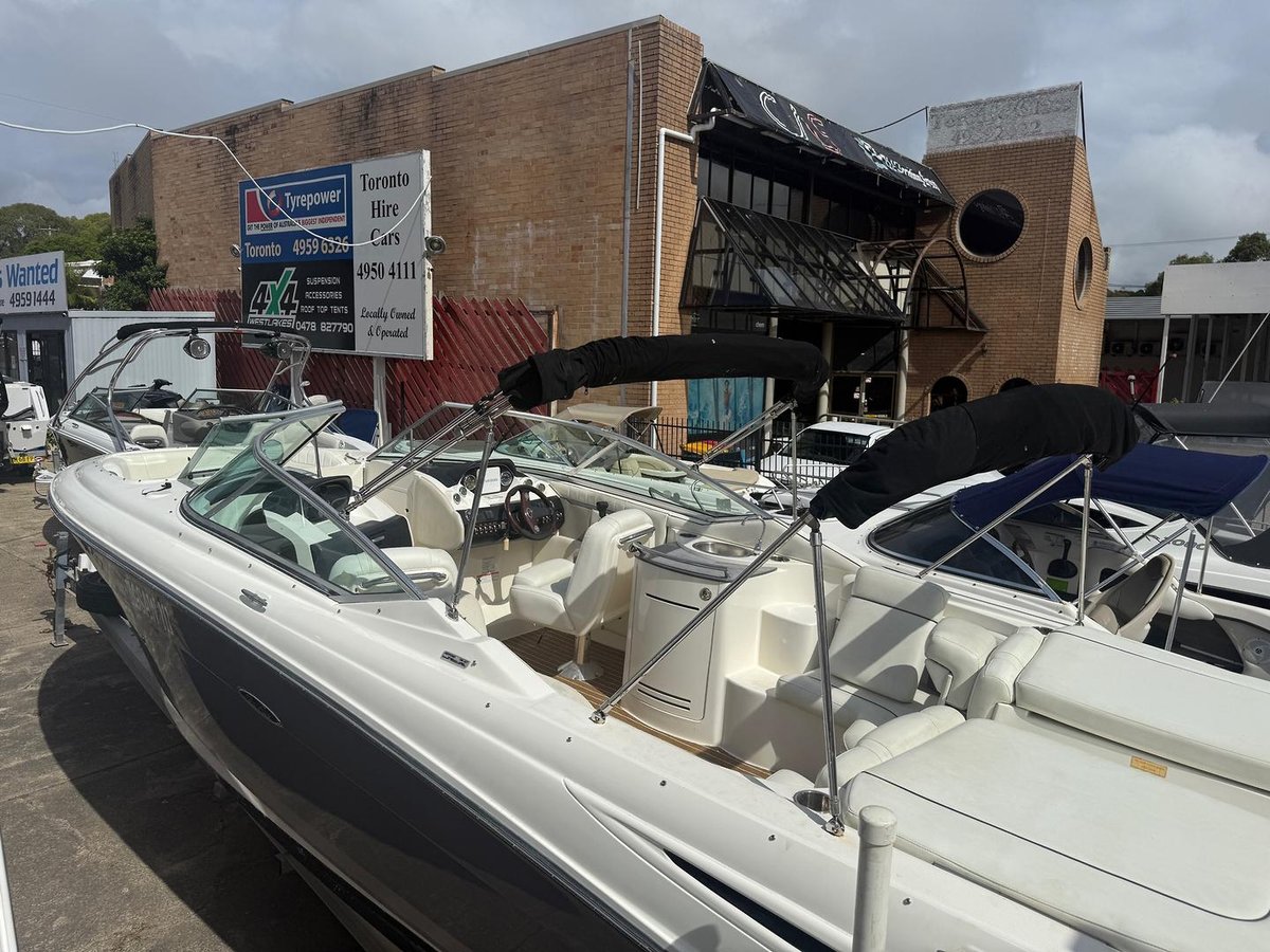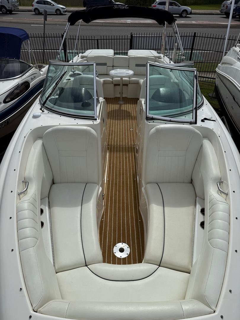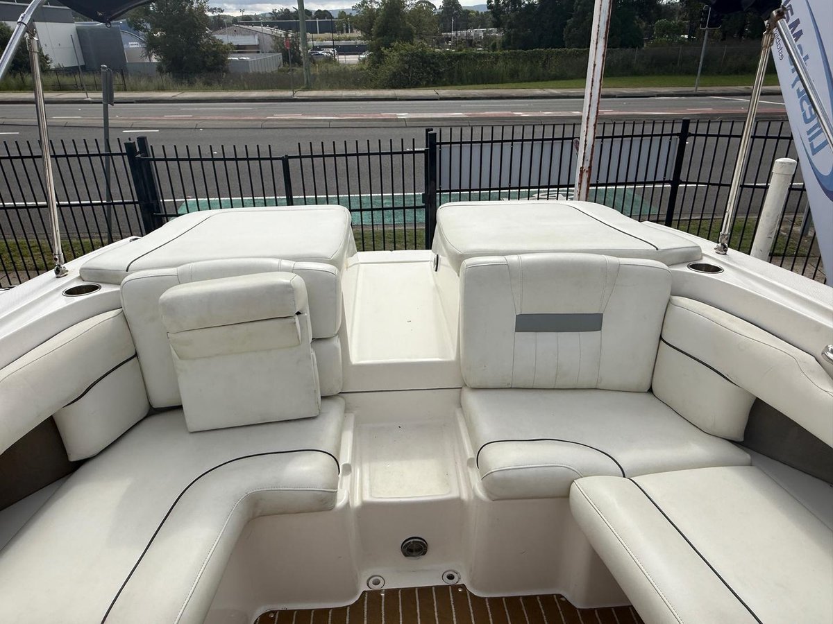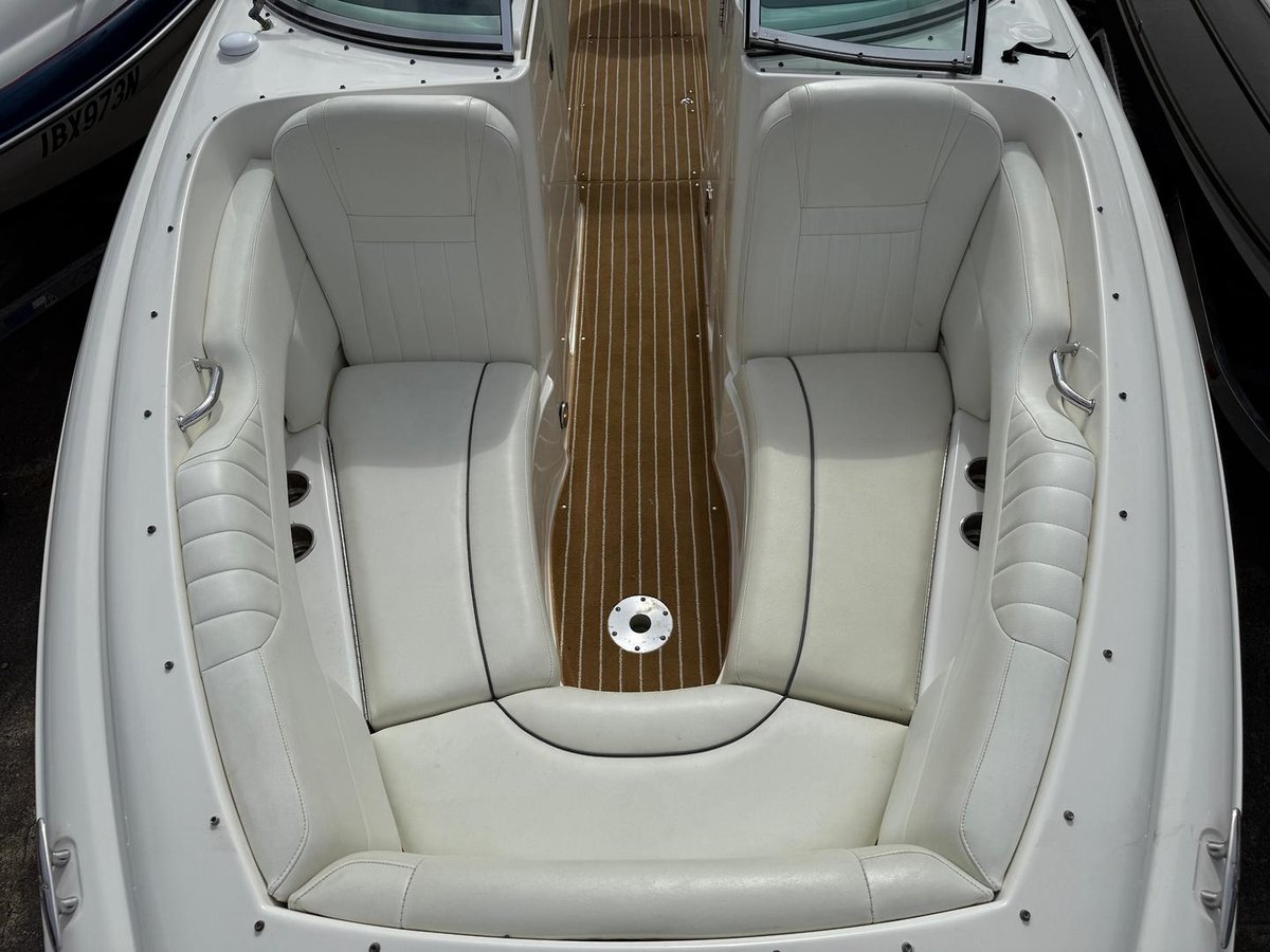 This one is fitted with colour hull, twin Bimini tops, bow and cockpit covers, power anchor winch, large telescopic boarding ladder, boarding platform, fresh water transom shower, walk through boarding access, full width removeable sunpad, u-shaped seating with storage under, new cockpit carpet, bow and cockpit tables, cockpit sink, driver and passenger seats with flip up bolsters, port side cubicle with vacu-flush toilet and sink, engine instrumentation, large underfloor storage, table and general storage in drivers console, bow seating with storage under.